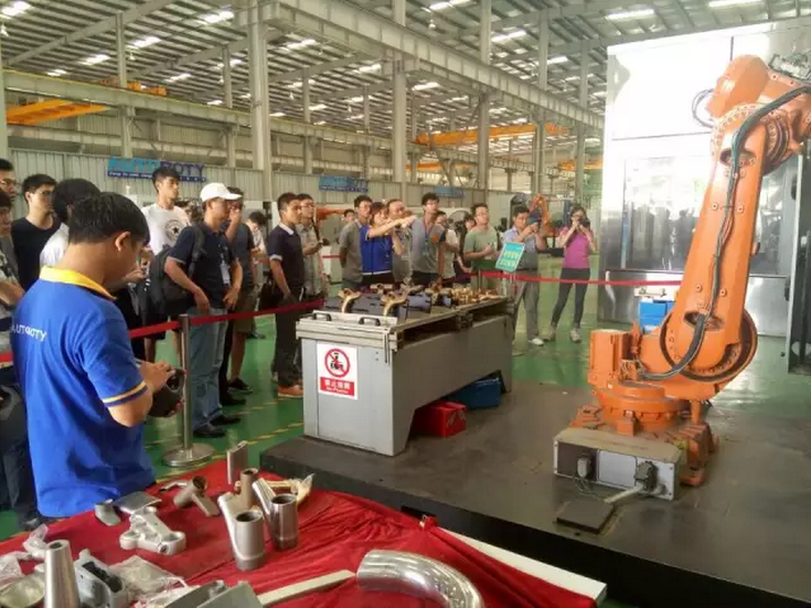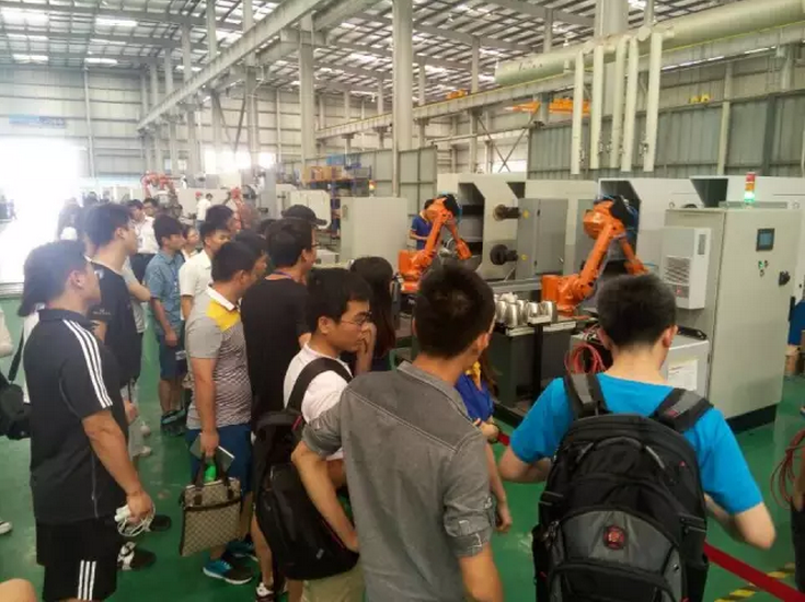 通过专业人员的讲解,以及与工业机器人零距离接触,大家亲身体验了未来工厂浓厚的科技气息,进一步认识了我司的创业历程以及工业机器人这一快速崛起的崭新行业。而面对车间里一个个灵活转动的机器人,学生们都感到非常兴奋。机器人舞狮伴着动感音乐跳起街舞,打磨机器人几乎零误差打磨出吉他,抛光机器人可以以一当十抛光浴缸……这些都勾起了学生们的好奇心和求知欲。