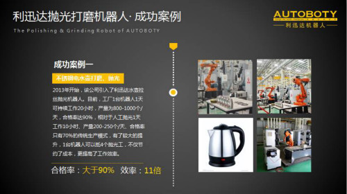 霍董说道,利迅达抛光打磨机器人之所以拥有很高的市场占有率,是因为坚持把研发创新视为公司发展的第一要务,包括与顶尖高校、世界名企的强强联手。如与ABB、广东省自动化研究所、北京航天航空大学、华南理工大学等合作打造了“省、市、区三级抛光打磨机器人应用技术工程中心”;与3M公司这样的磨料巨头在设备及工艺支持,尤其是新材料研发项目上一直保持紧密合作。3M也是目前最适合机器人使用的耗材供应商,综合效益也更高。