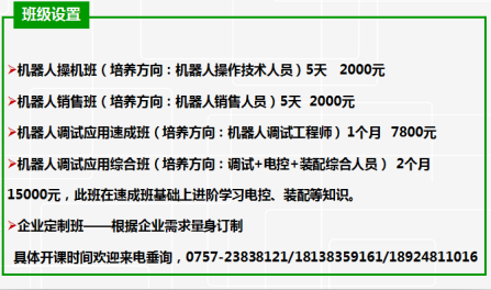 D、机器人调试应用综合班(培养方向:调试+电控+装配综合人员) 2个月 15000元,此班在速成班基础上进阶学习电控、装配等知识。